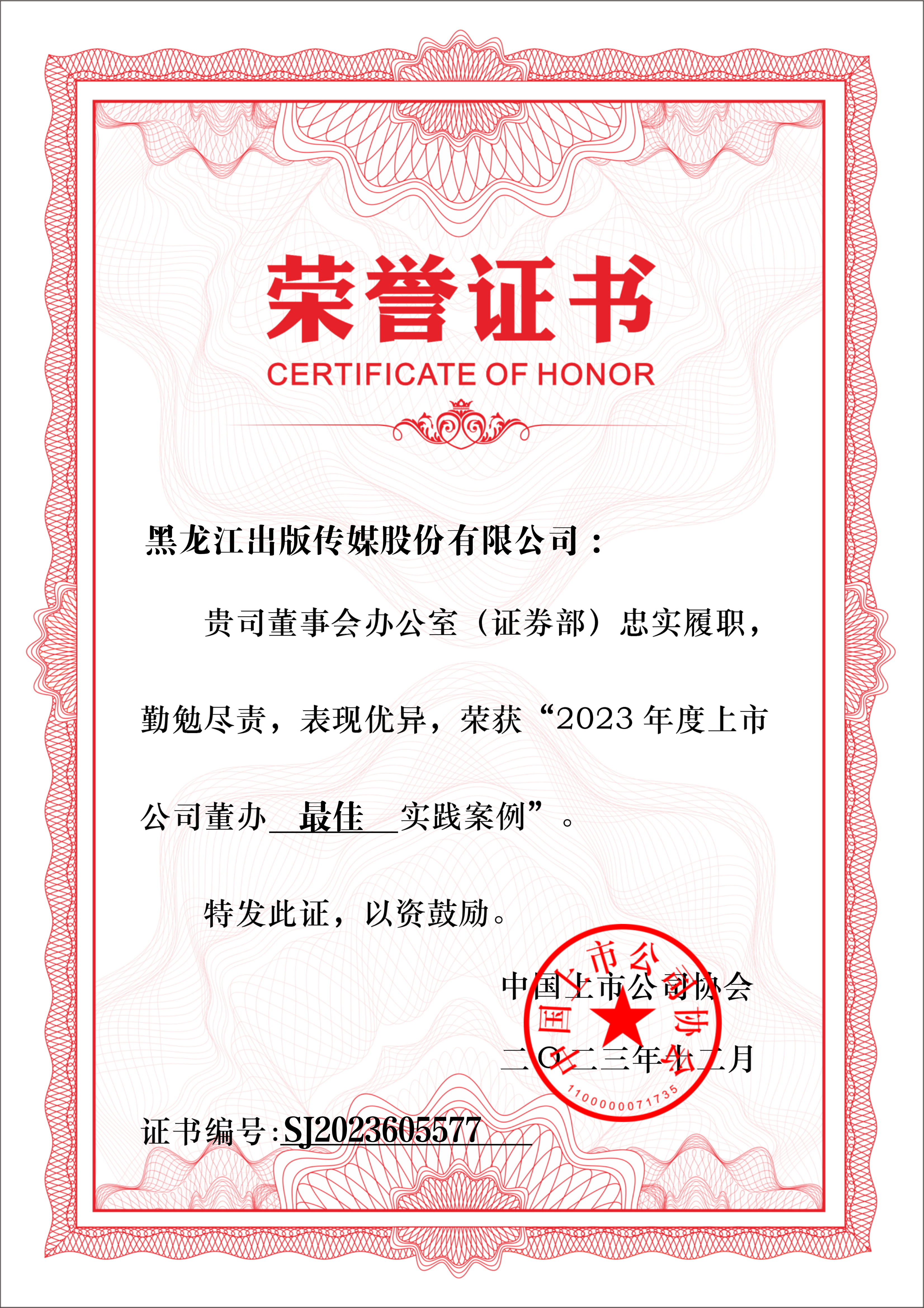 12月12日,中国上市公司协会发布“2023上市公司董办最佳实践”创建活动结果。龙版传媒在5000余家上市公司中脱颖而出,荣获“2023上市公司董办最佳实践案例”,是继去年获得董办优秀实践案例基础上再次获得的该奖项最高荣誉,也是我省唯一获得“最佳实践”的上市公司。
